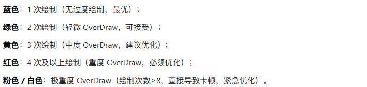 OverDraw表示GPU在同一帧内, 对屏幕上的同一个像素位置, 绘制了超过1次