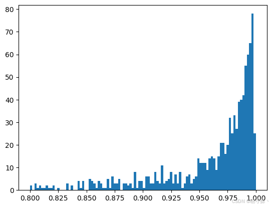 pyplot.hist(sims, bins=100, range=(0.8,1))