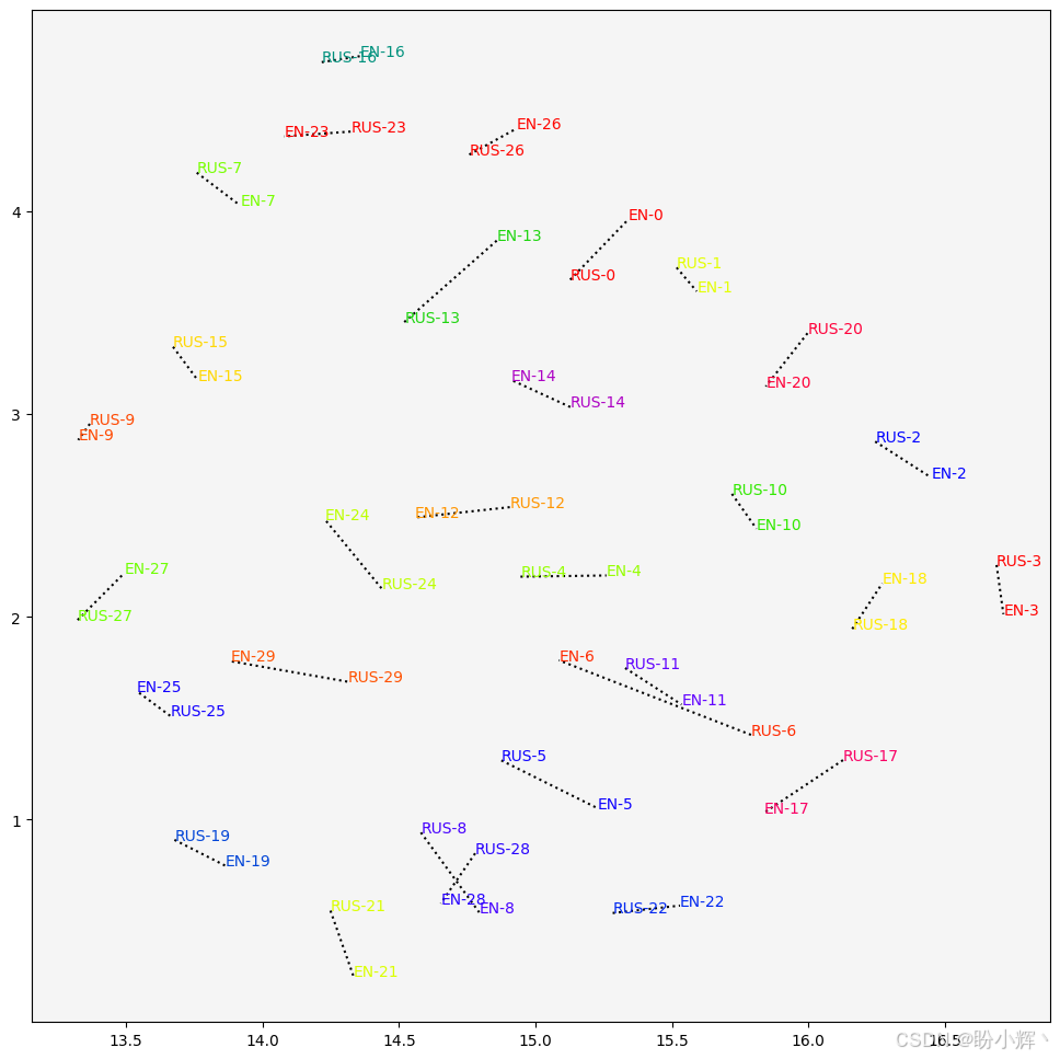 (4) 得到 60 个长度为 768 的向量。使用 UMAP 将维度降到 2。将互为翻译的句子对用相同的颜色和代码标记,并在它们之间绘制虚线以更明显地显示它们的关联: