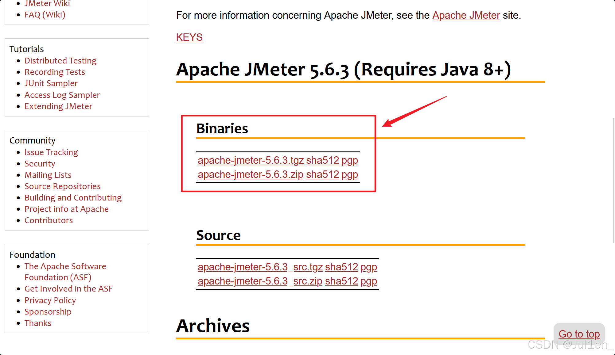 JMeter官网jmeter.apache.org/download_jmeter.cgi,点击Binary一栏,注意要求JDK为8及以上,选择任意解压包,下载后解压