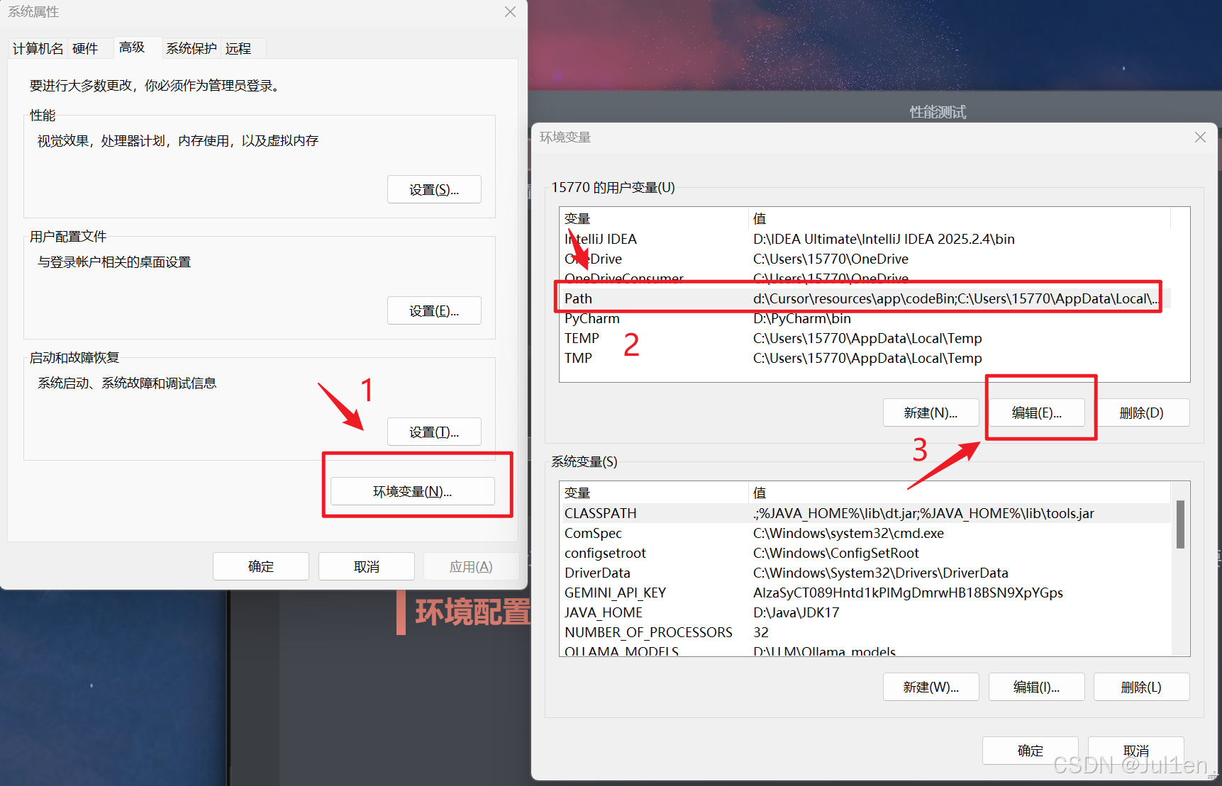 搜索"环境变量",在Path中新增你的JMeter所在的文件夹的bin文件路径