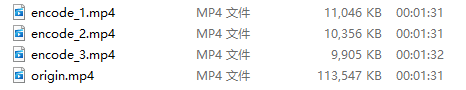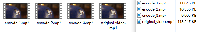 我将一段视频以CRF为26.5的参数,分别压缩了1、2、3次,可以看到,原视频是100M左右,压缩一次的视频大小是10.7M,压缩两次的视频大小是10.1M,压缩三次的视频大小是9.67M。