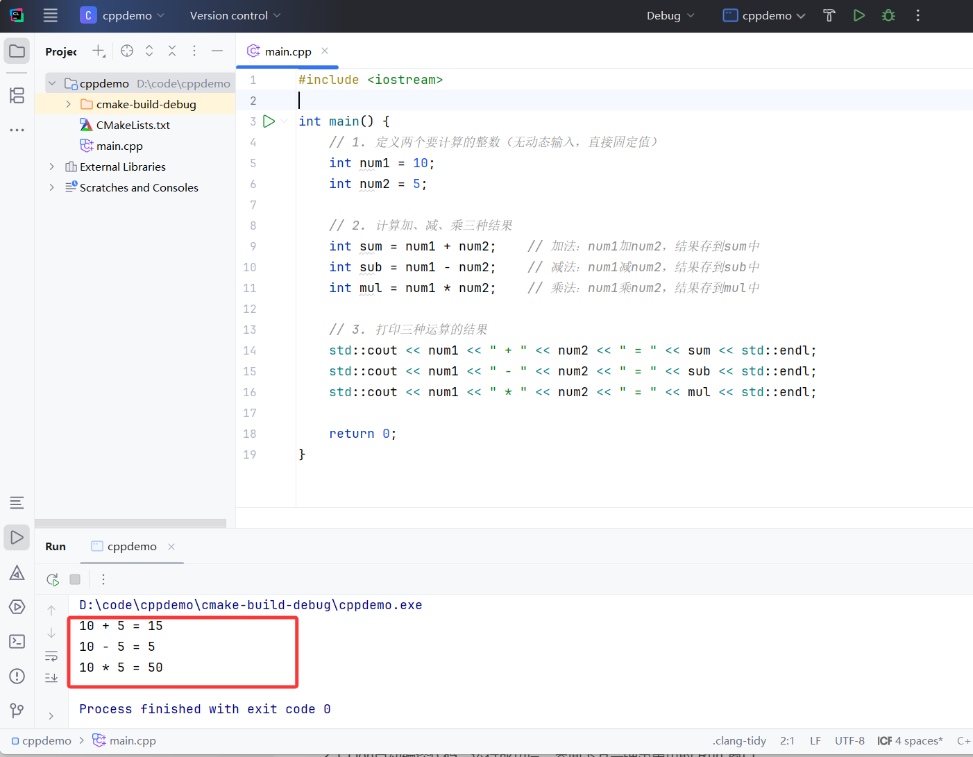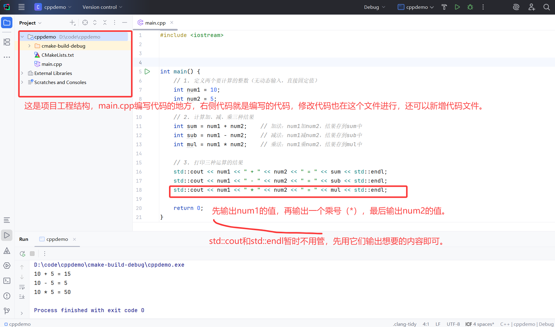 上一讲我们学会了用CLion编写第一个C++程序,成功让计算机打印出文字,体验了"写代码→运行出结果"的乐趣。这一讲我们进阶一步,实现一个简单的整数计算器,重点练习C++的算术运算,全程不用动态输入(不用手动敲数字,直接在代码中定义好要计算的整数),只实现"加、减、乘"三种运算,难度极低,零基础也能轻松上手。