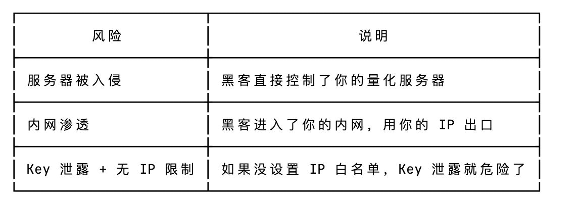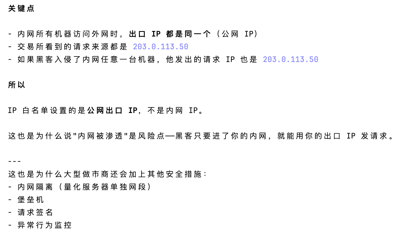 安全考虑:即使 API Key 泄露了,黑客拿到 Key 也没用,因为他的服务器 IP 不在白名单里,请求会被拒绝。