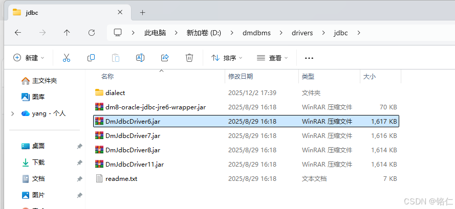 下面有DmJdbcDriver6、7、8、11 分别对应java的几个版本,老版本的达梦适配java8 的驱动叫DmJdbcDriver18,所以好多老教程还让你苦苦找DmJdbcDriver18,其实就是新版本数据库的DmJdbcDriver8