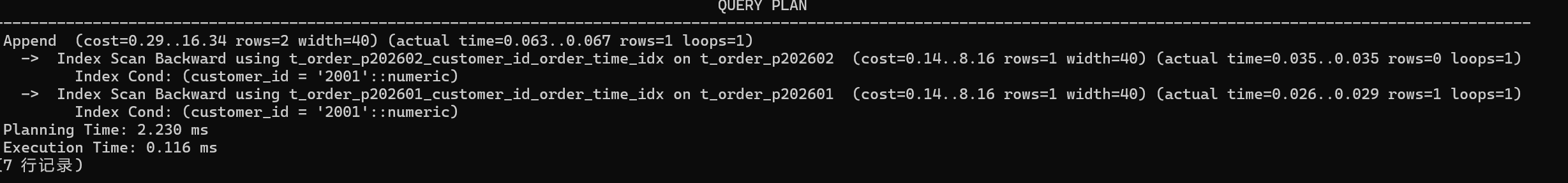 结果其实很能说明问题:它直接走了 Index Scan Backward,而且同样是按分区做 Append,计划里没出现额外的 Sort 节点。对 ORDER BY order_time DESC 这种查询来说,这通常意味着索引顺序刚好能满足排序需求,优化器就省掉了排序开销。Planning Time 大概 2.230 ms、Execution Time 大概 0.116 ms,至少在这个数据集下,路径是清晰且稳定的。