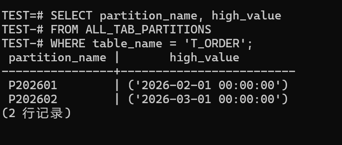 从图中结果看,P202601 和 P202602 的 high_value 分别是 2026-02-01 00:00:00、2026-03-01 00:00:00,跟我们建表时按月切分的预期一致。确认了这个,再谈"分区裁剪"才有意义。