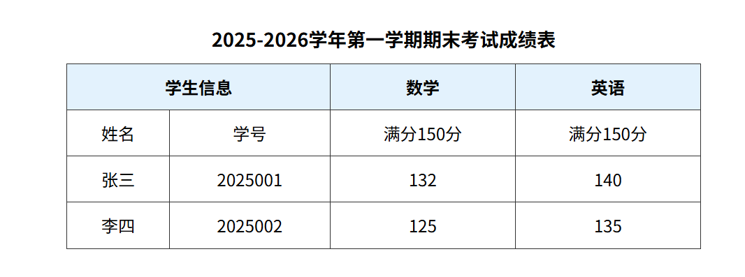 <caption>2025-2026学年第一学期期末考试成绩表</caption>
