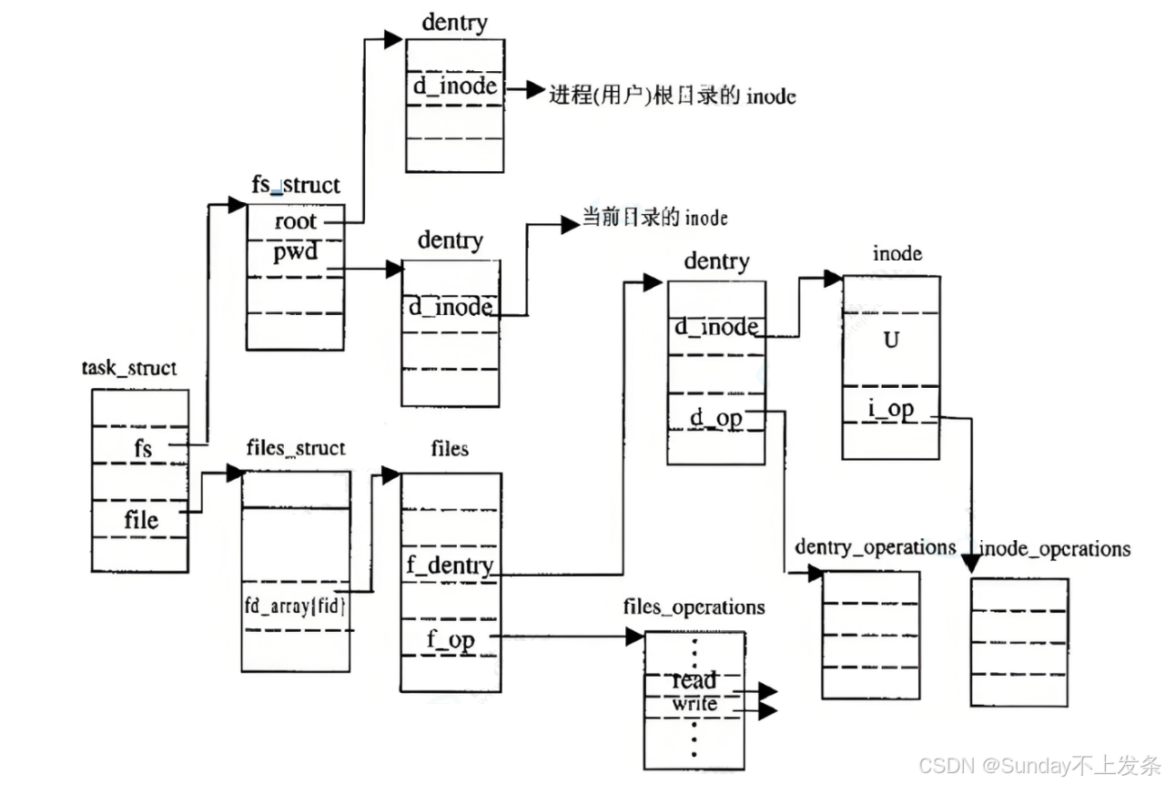 • 更重要的是,这个树形结构,整体构成了Linux的路径缓存结构,打开访问任何文件,都在先在这 棵树下根据路径进行查找,找到就返回属性inode和内容,没找到就从磁盘加载路径,添加dentry 结构,缓存新路径。
