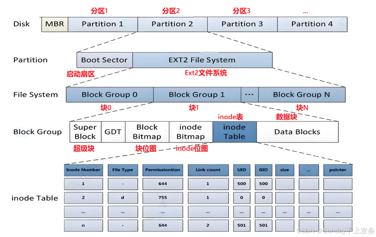 - inode编号以分区为单位,整体划分,不可跨分区,说明另一个分区的inode编号又从1开始。