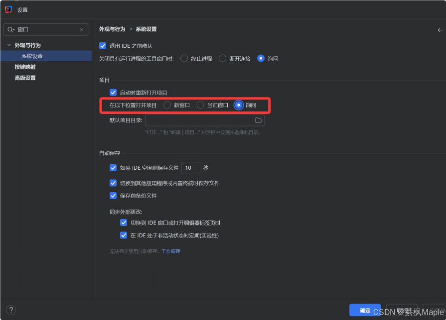 重复方法一的设置(打开项目于→询问),即可彻底恢复提示弹窗。