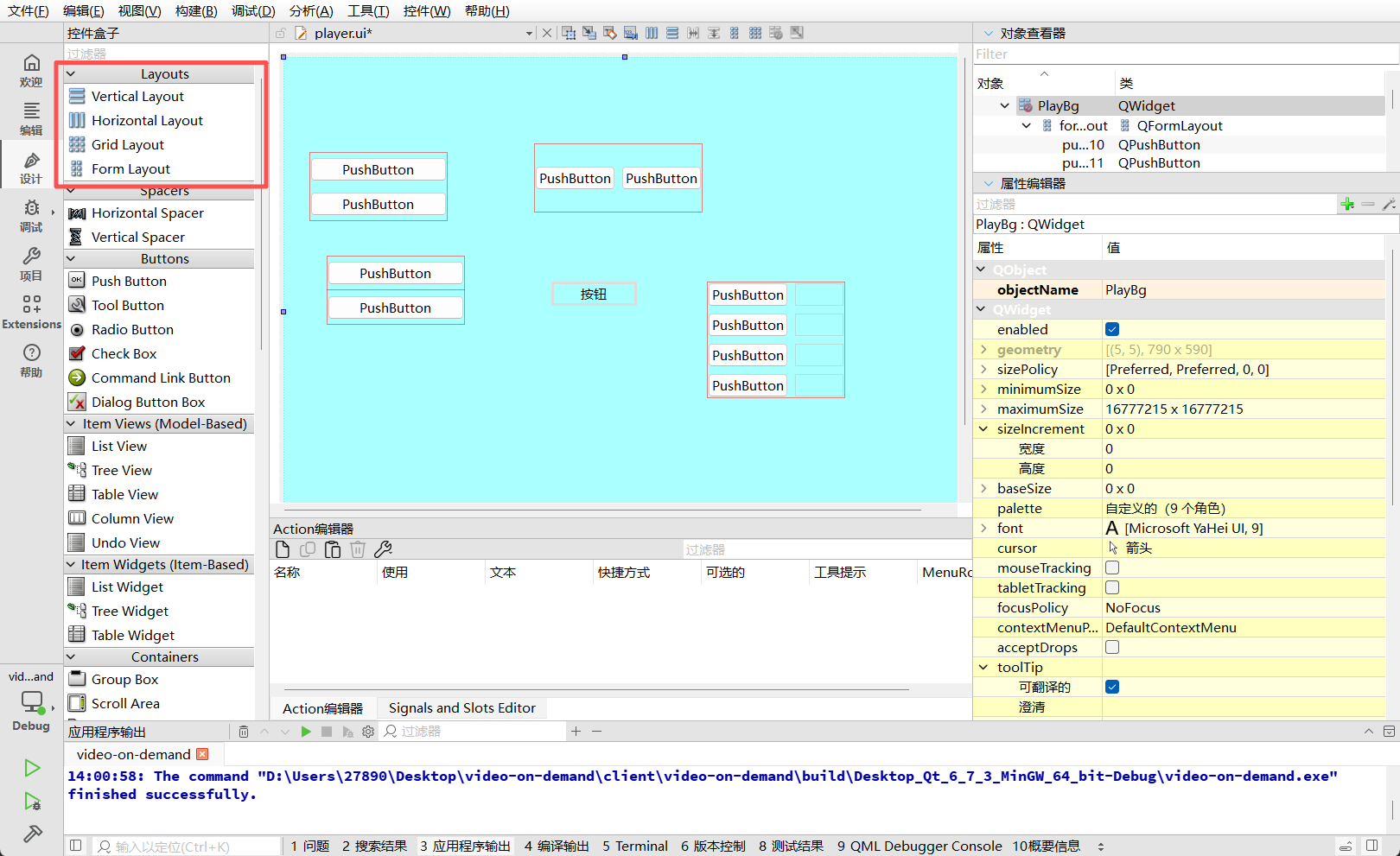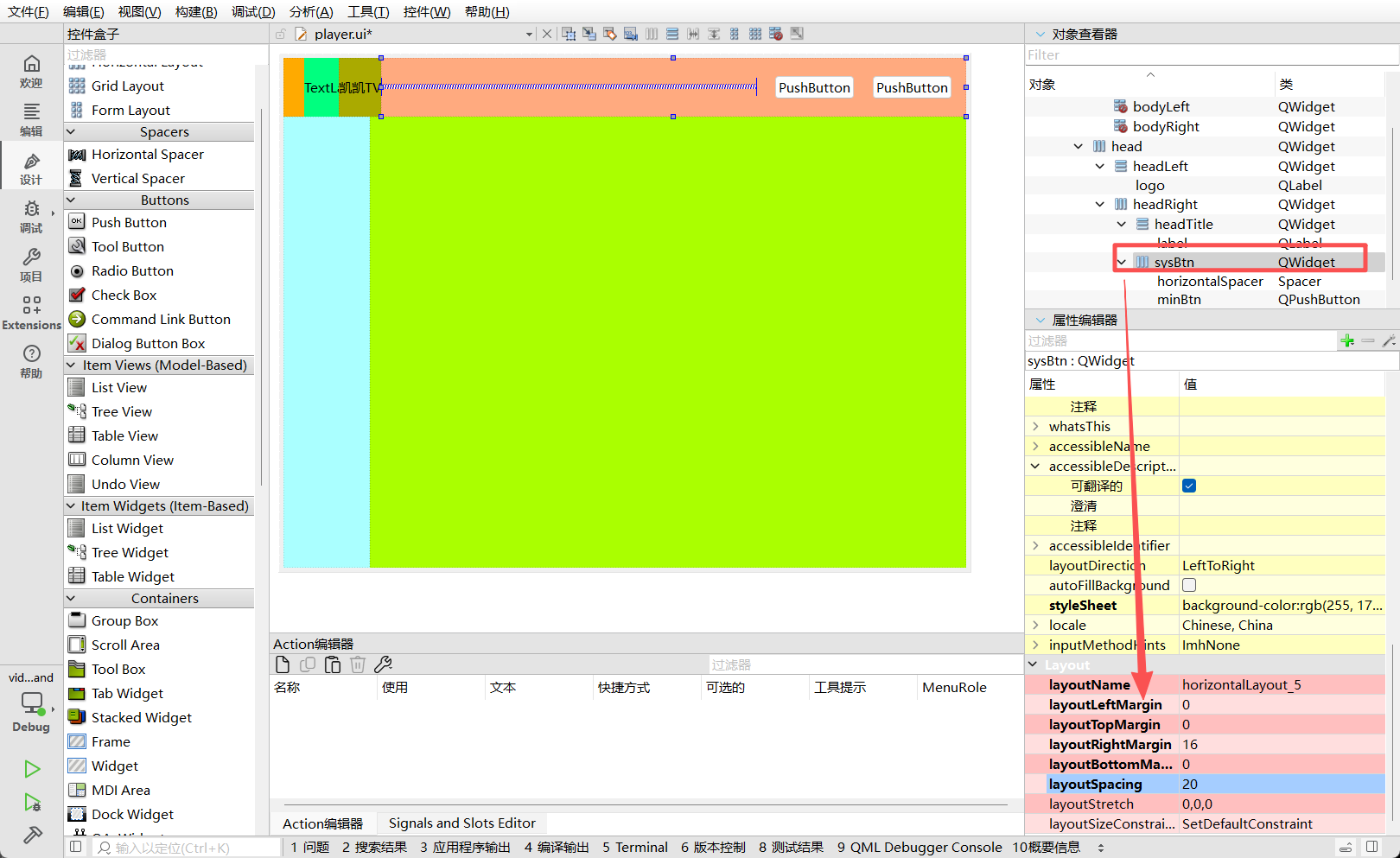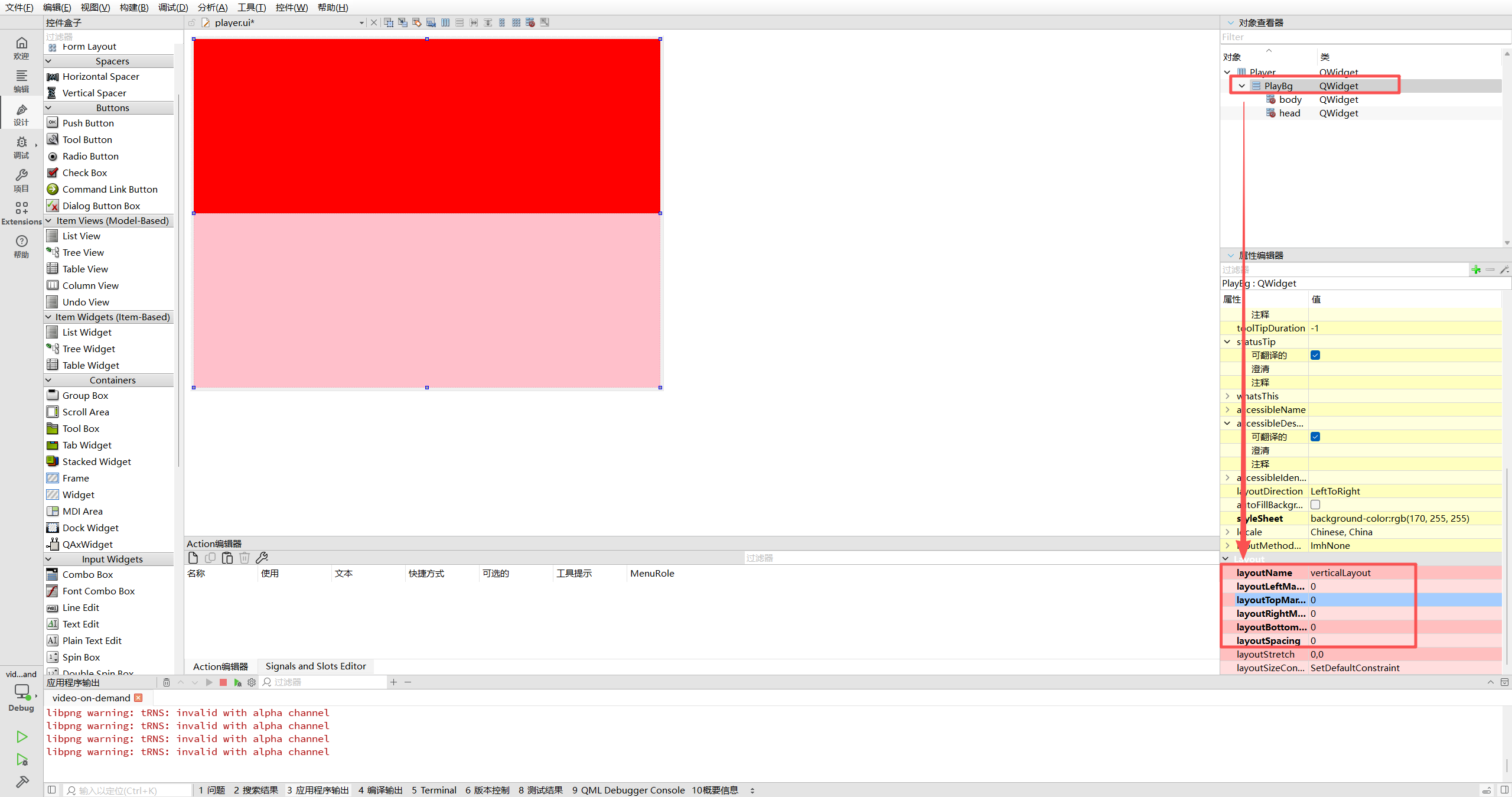 在主窗口的背景容器 PlayBg 中,拖入两个 QWidget,分别命名为 head 和 body。为了便于调试,暂时赋予它们鲜艳的背景色(红/粉)。