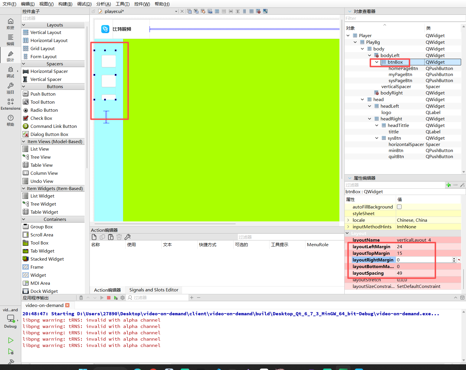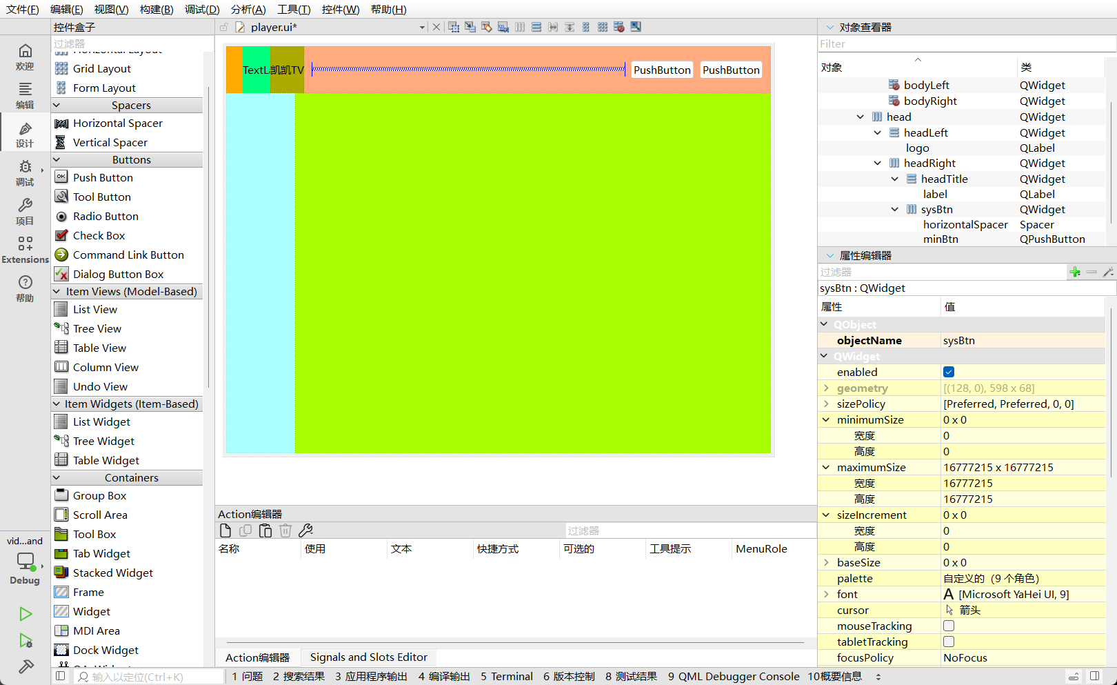 headTitle:放置QLabel显示"比特视频"字样或图片。sysBtn:放置最小化和关闭按钮。