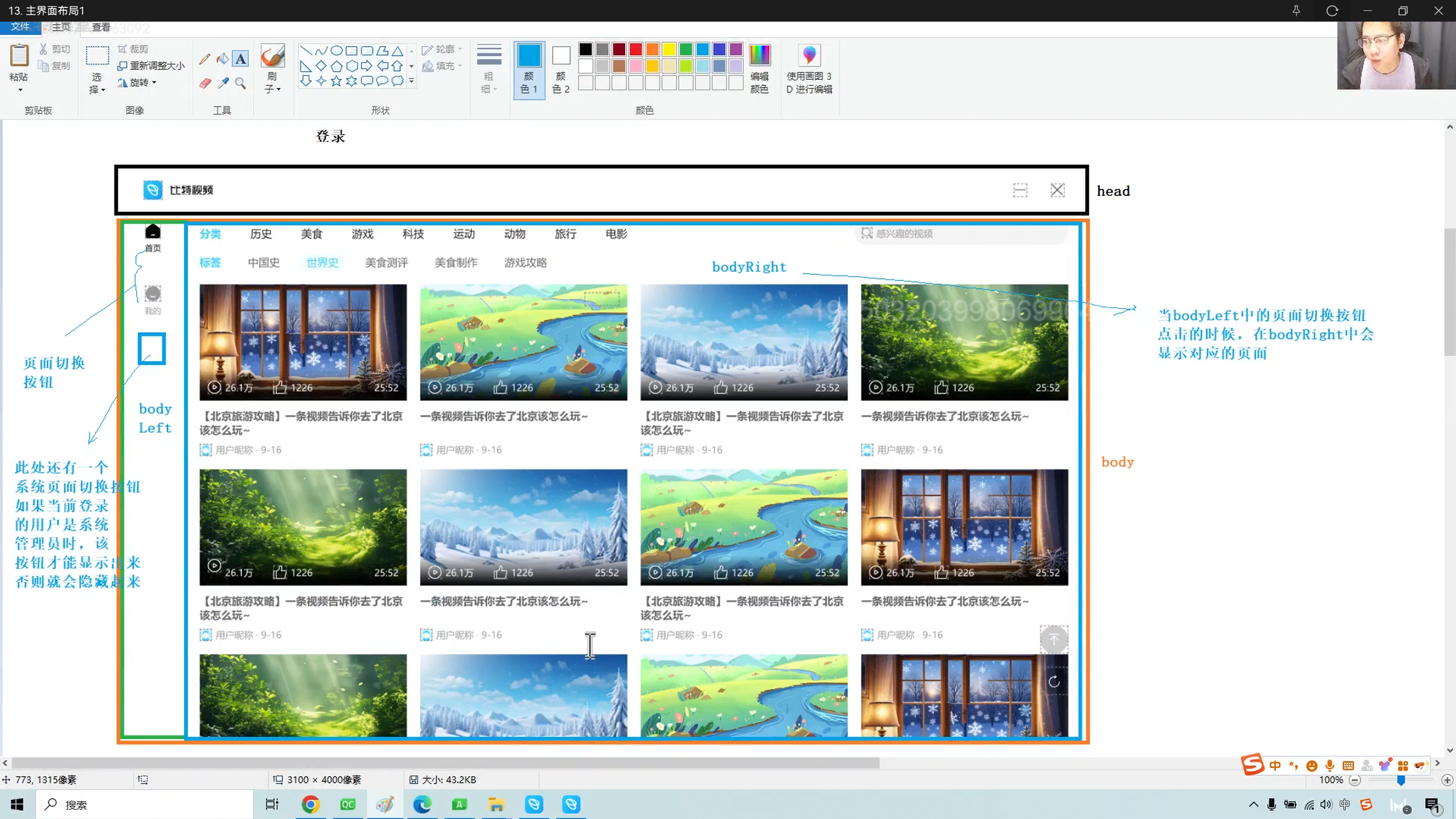 - BodyLeft(左侧导航栏):宽度固定 100px(或 64px,视设计而定),包含功能切换按钮。