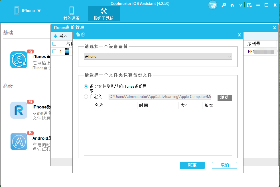 01一旦程序成功识别您的iPhone,请点击"超级工具包">"iTunes备份和还原">"备份"按钮。然后,从下拉菜单中选择要备份的设备。