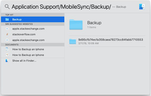 单击"搜索"图标>复制并粘贴:"~/Library/Application Support/MobileSync/Backup/",然后按键盘上的"Return"键。