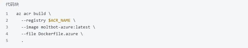 核心价值:无需在本地安装 Docker,无需上传数百 MB 镜像,所有构建操作在 Azure 云端完成,快速高效。构建完成后,将获得可被 Web App 拉取的镜像地址:${ACR_NAME}.azurecr.io/moltbot-azure:latest
