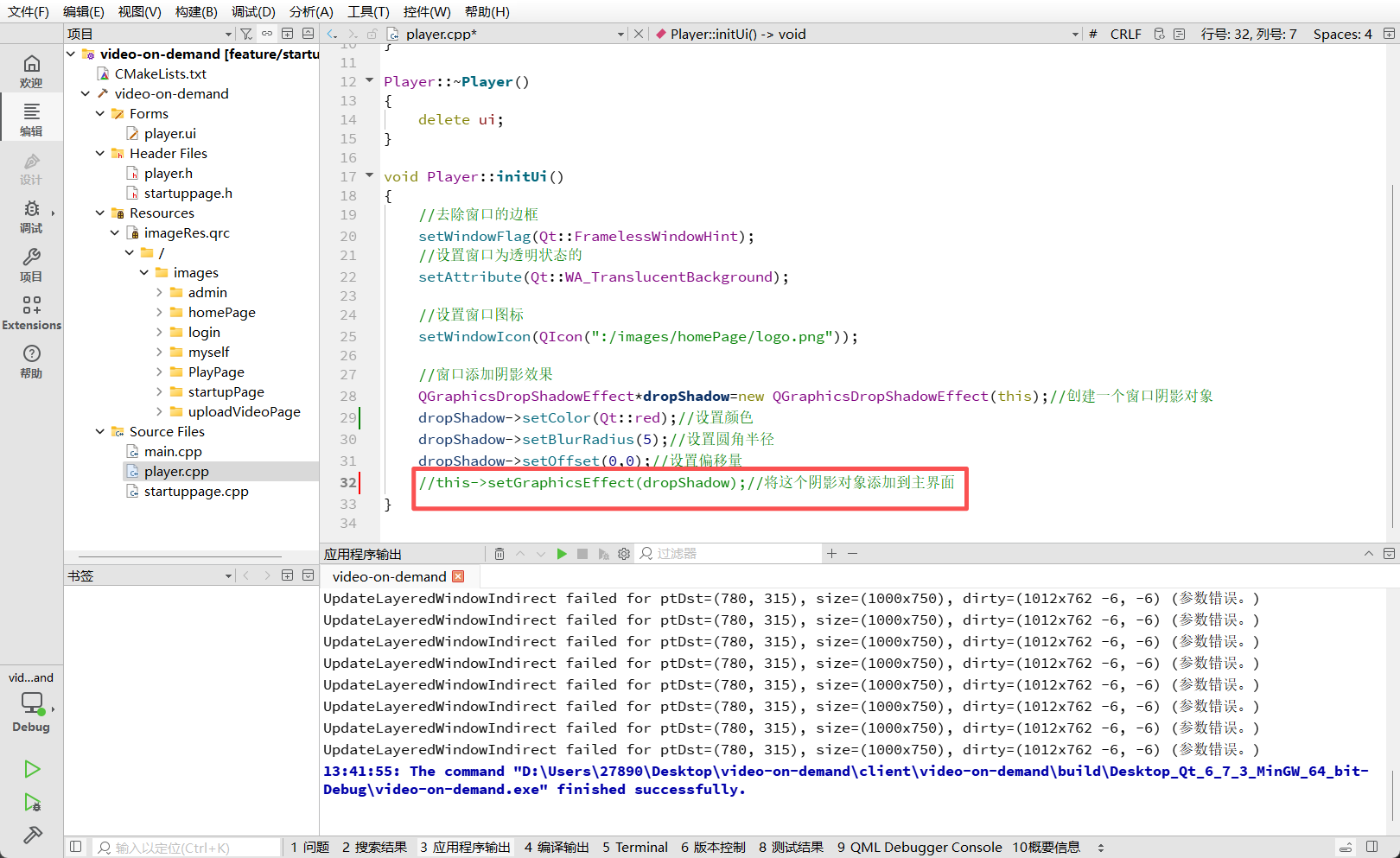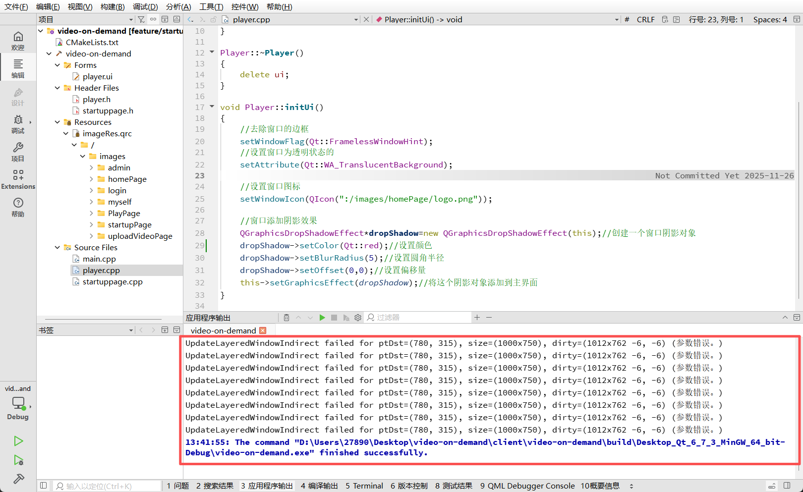 在开发过程中,若将阴影直接应用在顶层窗口(或者父子关系处理不当),程序运行时可能会在"应用程序输出"窗口疯狂打印错误信息: