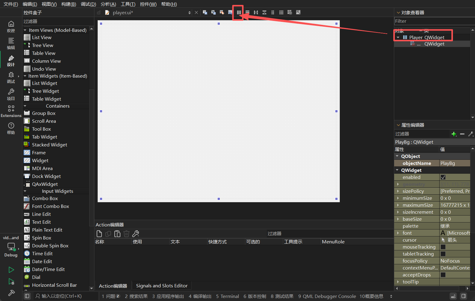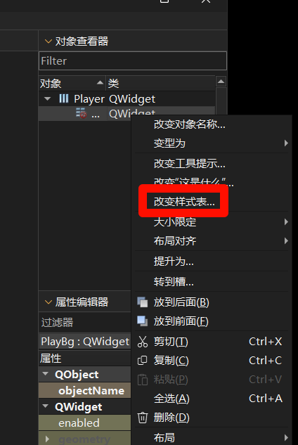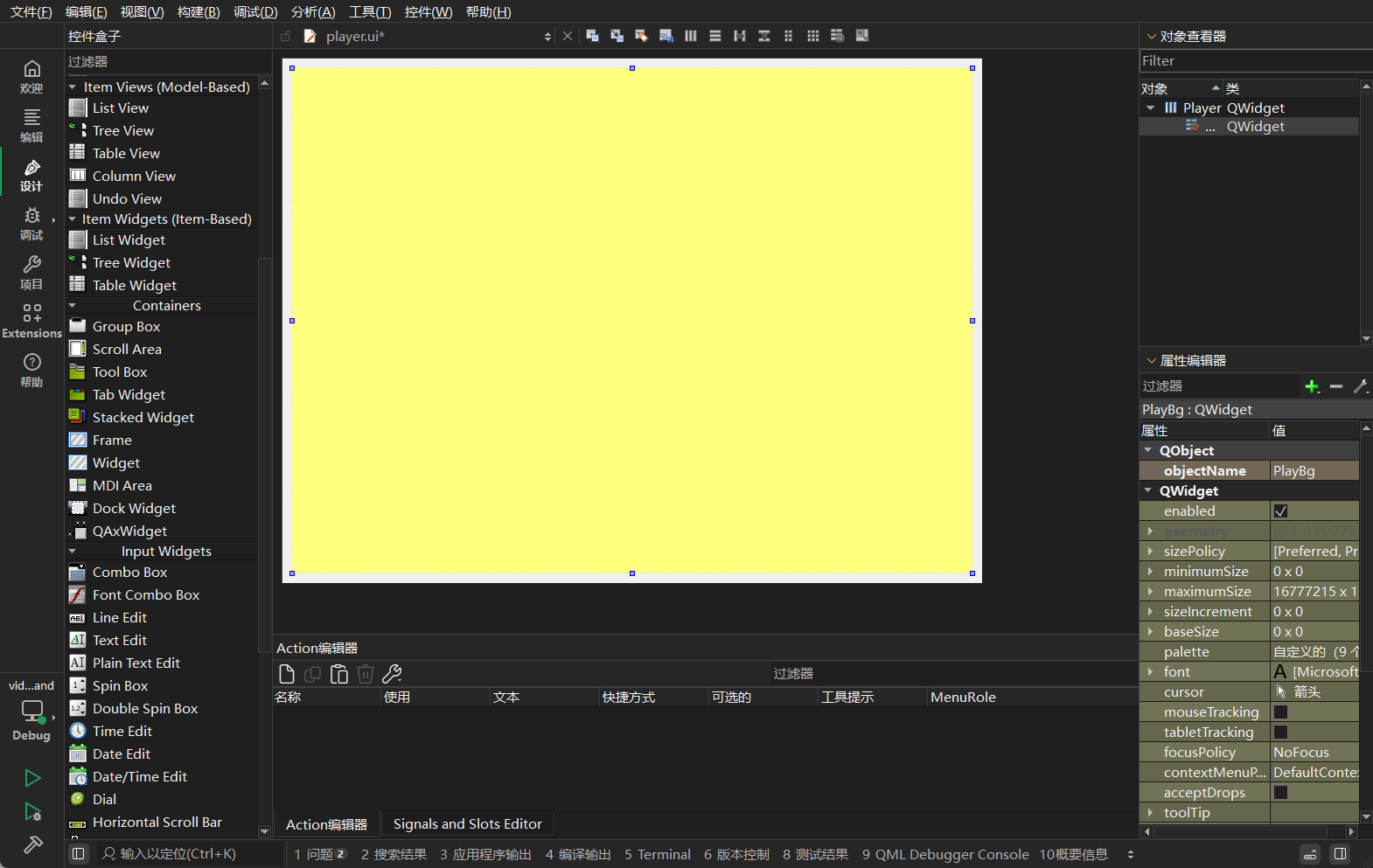 拖入一个新的 QWidget,命名为 PlayBg。这个 Widget 将充当实际的视觉背景。