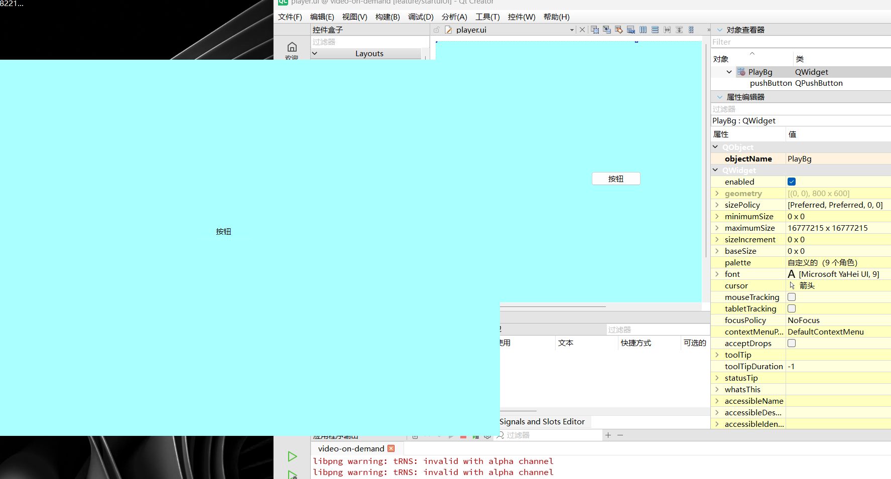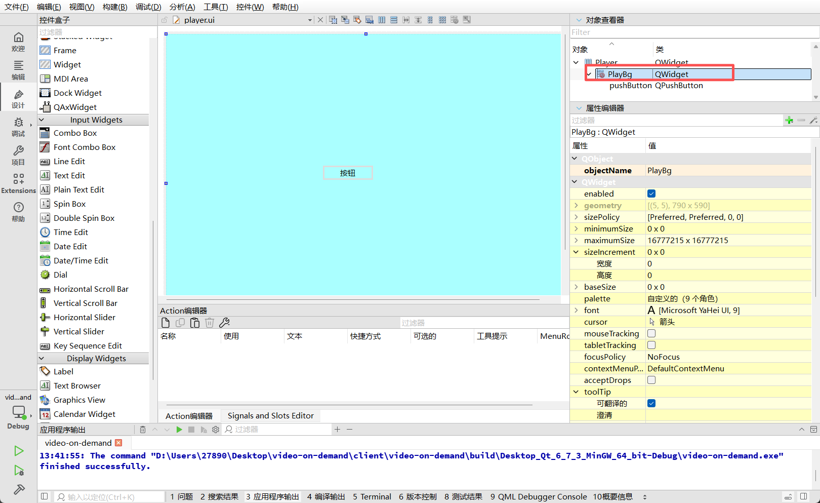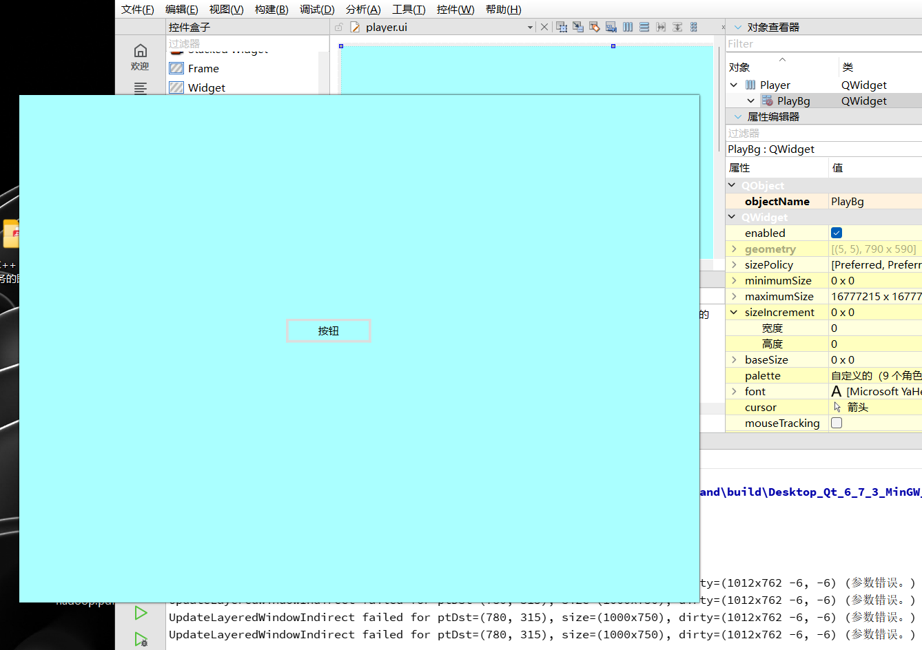 拖入一个新的 QWidget,命名为 PlayBg。这个 Widget 将充当实际的视觉背景。