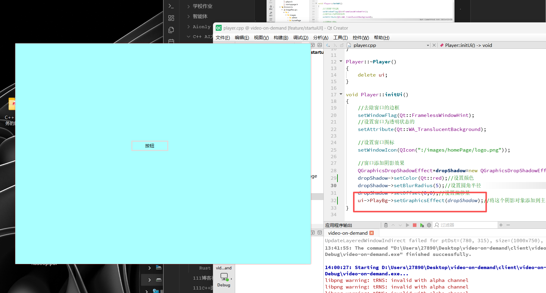 解决方案正如 9.3 节所述,转移宿主 。确保 QGraphicsDropShadowEffect 的宿主是子控件 PlayBg,而非顶层窗口本身。
