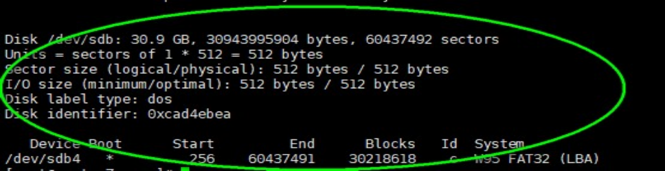 这一步需要根据显示结果找到U盘对应的卷标, 例如我的U盘空间32G,可以确定就是下图的/dev/sdb4: