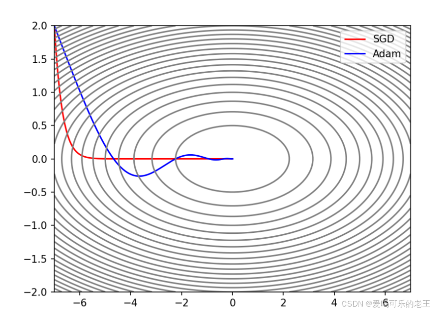 beta1, beta2 = betasfor epoch in range(n_iters): # 计算梯度 grad = 2 * X * w.T grad.squeeze_() # 更新一阶矩估计和二阶矩估计 V = beta1 * V + (1 - beta1) * grad H = beta2 * H + (1 - beta2) * grad ** 2 # 偏差校正 V_hat = V / (1 - beta1 ** (epoch + 1)) H_hat = H / (1 - beta2 ** (epoch + 1)) # 更新参数 X.data -= lr * V_hat / (torch.sqrt(H_hat) + 1e-8) # 记录轨迹 X_arr.append(X.detach().numpy().copy()) return np.array(X_arr)def gradient_descent(X, optimizer, n_iters):