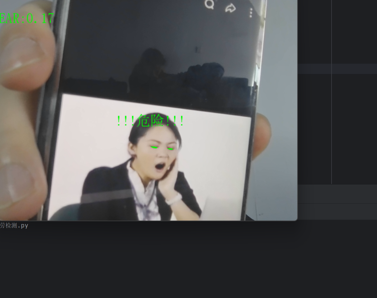 检测逻辑:设定EAR阈值为0.3(可调整),当检测到EAR低于该阈值时,则判定眼睛处于闭合状态,并递增一个连续低EAR帧计数器。如果计数器累计达到或超过50帧(通常对应约1.5左右的持续时间),则判定为疲劳状态,并在视频帧的指定位置(250,250)叠加"!!!危险!!!"的中文警告文字。若中途EAR值恢复至阈值以上,计数器会立即重置为零。通过累加连续帧数触发警报的机制,有效过滤了正常眨眼等短暂动作,从而防止了误判,确保警报仅在持续、长时间的闭眼事件发生时被触发。