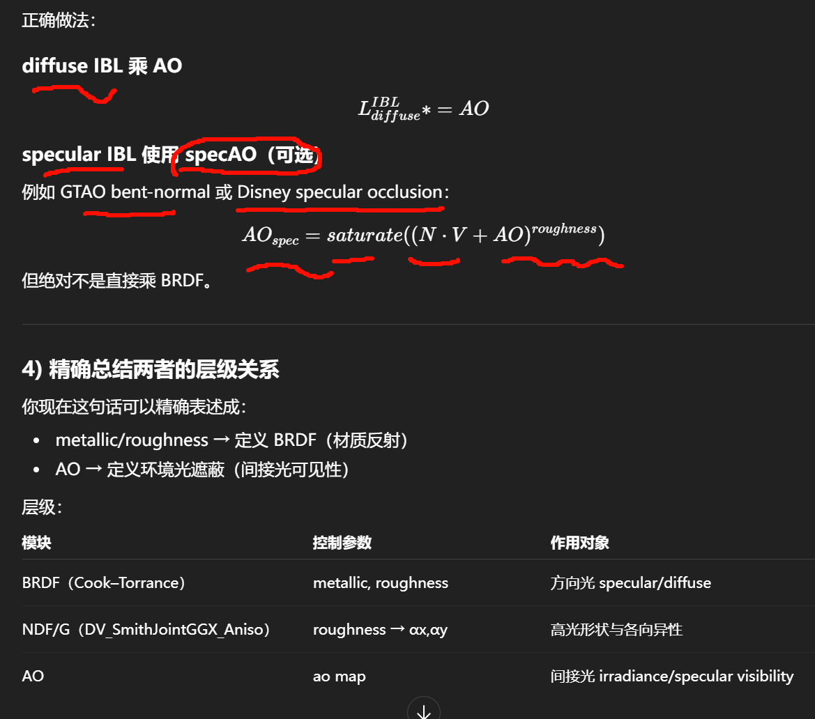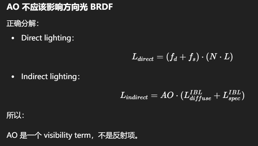 - IBL:用预过滤环境贴图 + BRDF 近似,把 D 和 G 的平均效应"打包"进采样结果;因此只保留 F 的角度依赖做最后的权重。