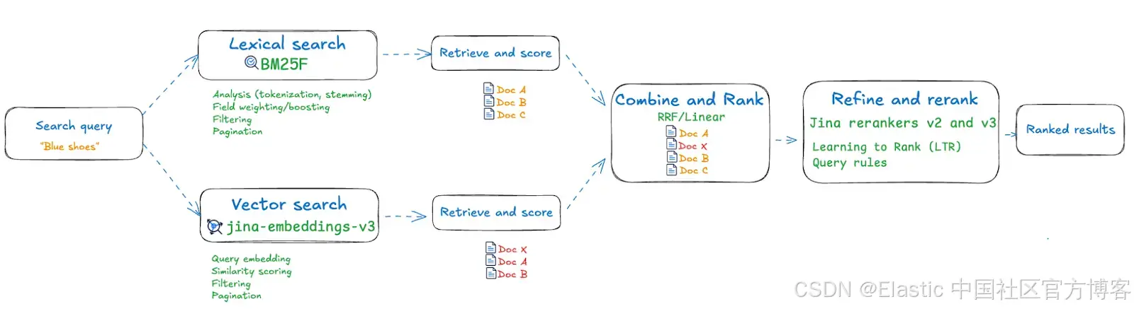 此前 EIS 上已推出 jina-embeddings-v3 ,扩展了多语言 reranking 的模型目录。开发者现在可以结合 BM25F 词汇搜索和来自 jina-embeddings-v3 的多语言向量搜索进行混合搜索,再根据具体使用场景使用 Jina Rerankers v2 或 v3 进行重排序,从而在 Elasticsearch 中原生实现对召回调优的完全控制。