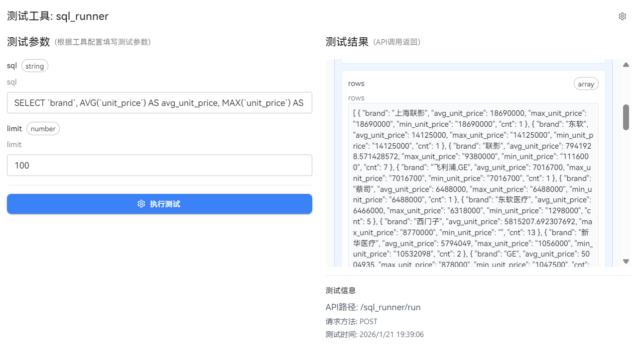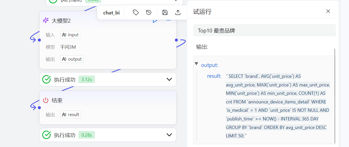 从截图可以看到,我们在 openJiuwen 的工作流画布中,已经把 SQL 生成 Agent 独立成一个可运行节点,并通过 Top10 最贵品牌 这个典型问数需求完成了一次完整推理。