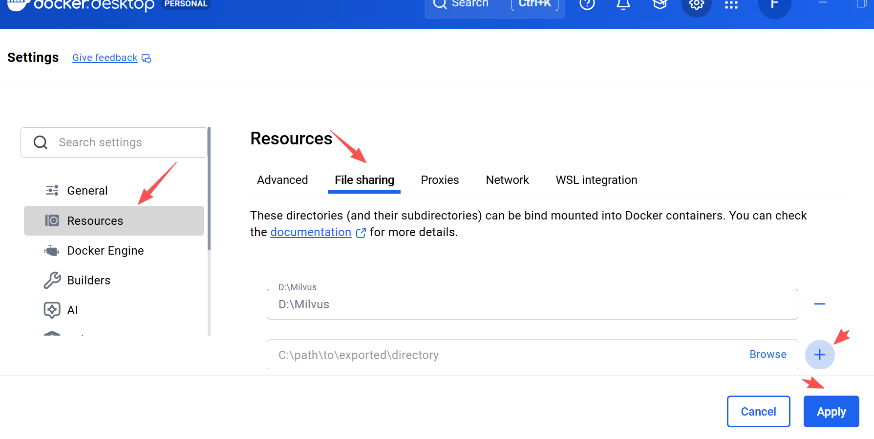 - 打开 Docker Desktop,按照图示步骤,在序号 4 处输入 Milvus 安装目录 (例如:D:Milvus);