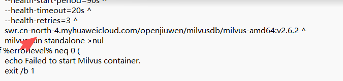 - 将 "standalone.bat" 文件内的 milvus 官方镜像名(比如: milvusdb/milvus:v2.6.9) 内容修改为 对应的镜像名(X86机器镜像名:swr.cn-north-4.myhuaweicloud.com/openjiuwen/milvusdb/milvus-amd64:v2.6.2`)。