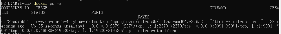 启动后,输入 docker ps -a 命令可查看到名为 Milvus-standalone 的 docker 容器在 19530 端口启动。