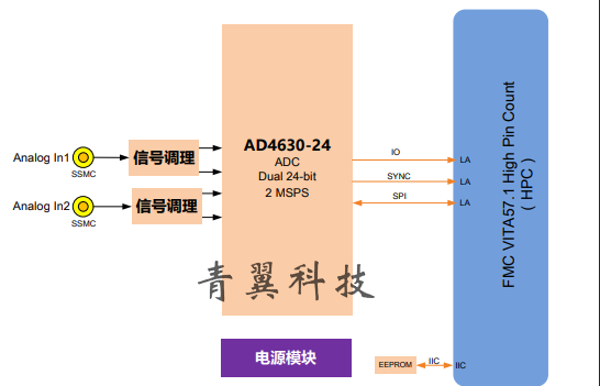 FMC119 是一款基于 VITA57.1 标准规范,实现 2 路 24-bit、 2MSPS 采样率的 AD 采集子卡模块。该模块遵循 VITA57.1 标准,可 作为一个理想的模块直接与符合 VITA57.1 标准的 FPGA 载板配合使 用,板卡 ADC 器件采用 ADI 公司的 AD4630-24 芯片。
