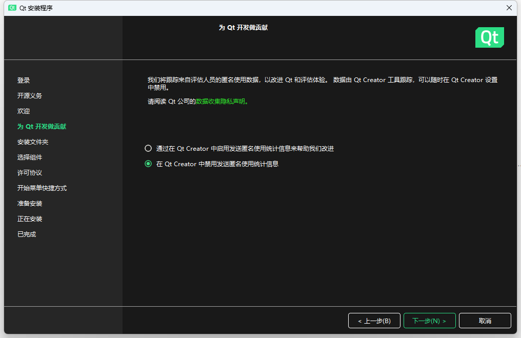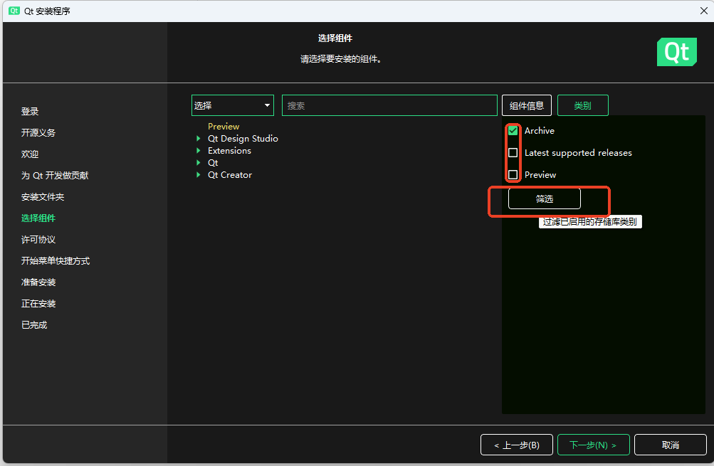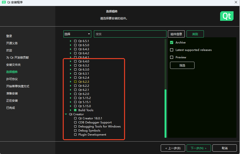 我们可以选择QT5.15.2,也是一个比较经典的版本,QTCreater就只有一个可选的版本(18.0.1),选好之后一路下一步,剩下的交给时间~