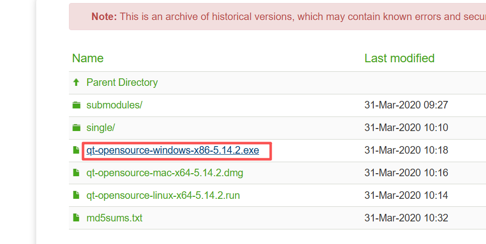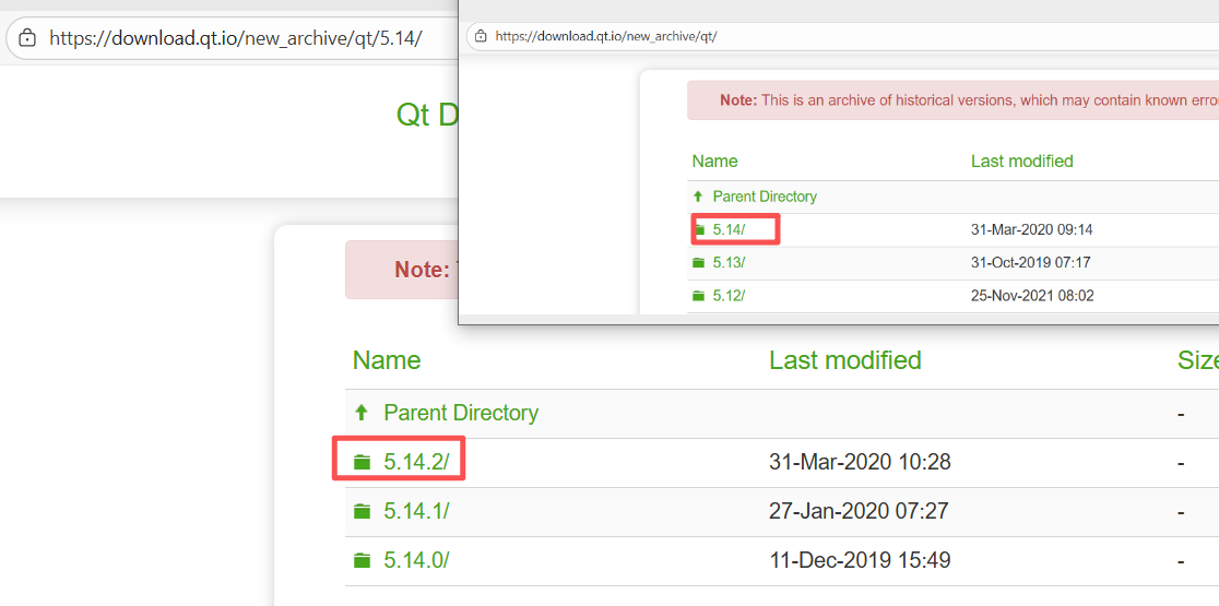 通过在线安装的方式我们也可以发现,支持的最早版本也就只到5.15,再早的版本是没有的,也就是说如果我想安装5.14或者更早的版本,就只能选离线安装了。离线安装适用于所有老版本QT,但是想要找到下载通道可不是个容易的事,很多版本在国内的镜像源是根本没有的。大家可以去清华源、阿里源等验证一下。这里直接给大家提供一个最全的QT离线安装包下载地址,有些内容点进去会显示网页不存在等提示,那是因为国内的IP无法访问,需要科学上网才行。依然以5.15.2为例,在这个网页选择5.15版本,进入后继续选择5.14.2: