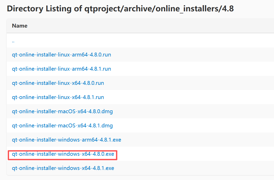首先我们先来到 QT在线安装程序的官网,这个在线安装包并没有很严格的版本要求,进去之后我们选择一个不算太新的版本4.8: