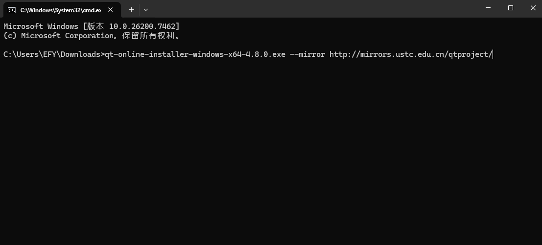 下载好之后,使用win+r输入cmd进入到命令行窗口,然后使用cd进入到qt-online-installer的下载路径,然后输入这段代码,启动安装程序的同时切换到国内的镜像源: