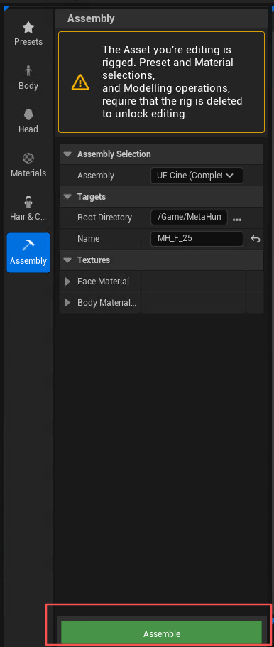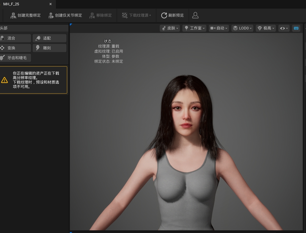 只创建骨骼结构和身体的绑定,不包含面部控制器、表情动画、头发、Groom 等 MetaHuman 特殊资产