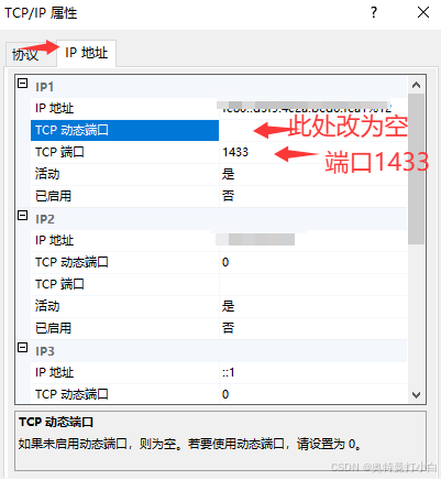 设置 "TCP 端口" 为1433(SQL Server 默认端口),清空 "TCP 动态端口" 输入框;