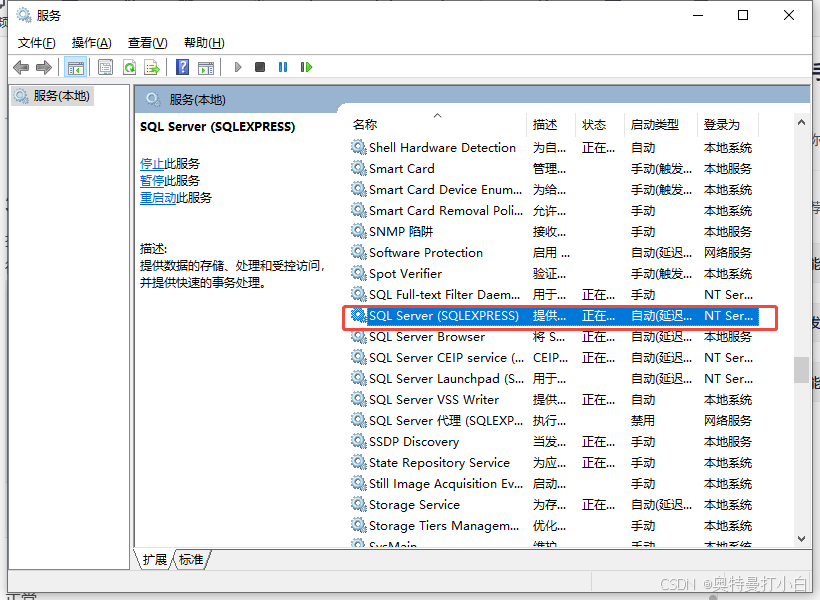 打开 "服务"(Win+R 输入services.msc),确认 "SQL Server (SQLEXPRESS)"服务处于 "正在运行" 状态;