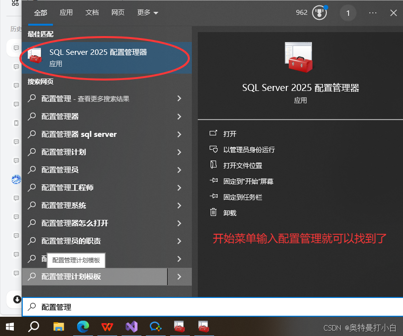 开始菜单,搜索"配置管理",打开SQL Server 2025配置管理器
