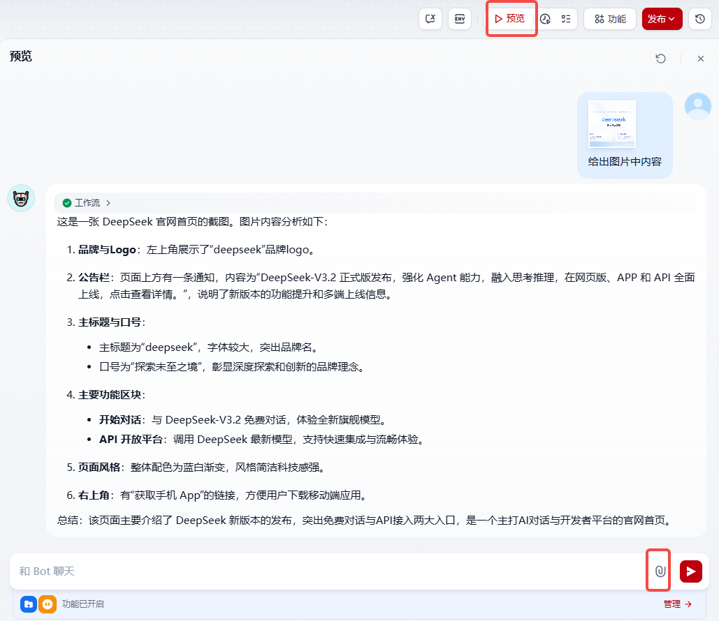 点击预览,发送一张deepseek主页图片,让他解析,结果如下图: