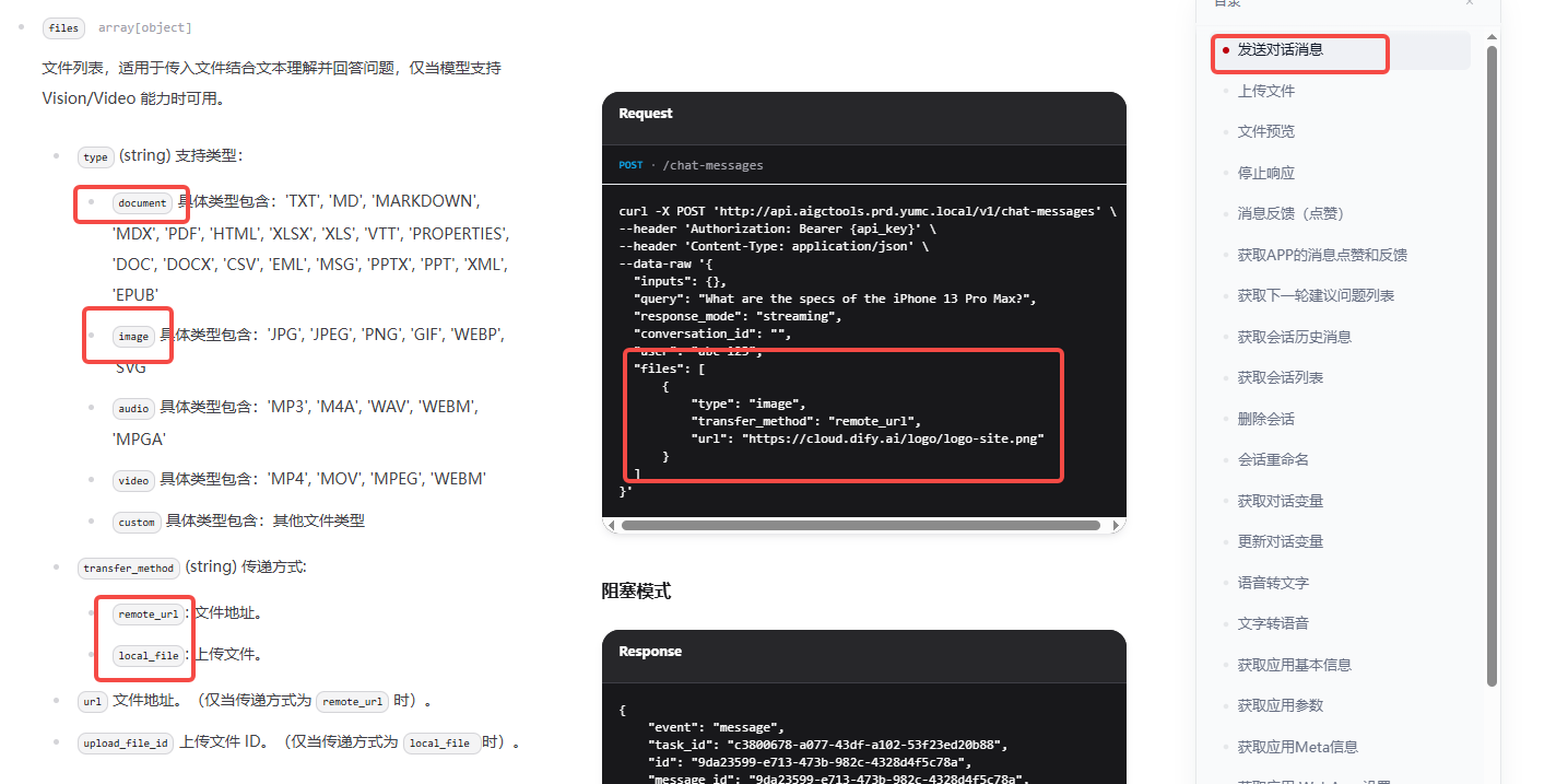 type 如果是image 对于图片,document 对应文档, 如果选择本地上传 upload_file_id 为上面图片上传接口返回的id, 参数transfer_method 为 "local_file"