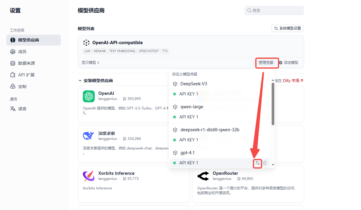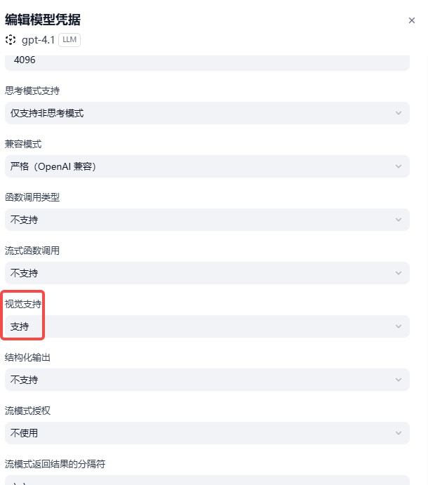 - LLM我选择的是Gpt4.1 ,需要到模型配置==》管理凭据 ==》 编辑中将视觉支持修改为支持