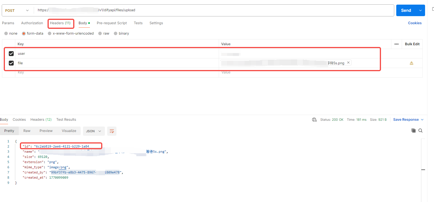 上传文件接口参数比较简单,post请求截图如下,用过post的应该都清楚如何填写,需要说明一下的是返回值中的id 字段就是接下来我们调用聊天接口需要传入的文件Id