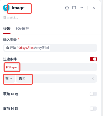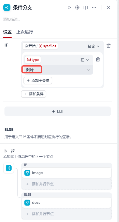 【2】加入条件节点,条件节点配置如下,如果文件类型是图片则走上面分支处理,其他情况都走下面路径处理: