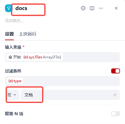 【7】在条件节点else分支添加列表节点,名称修改为DOCS,用于开始处理文档