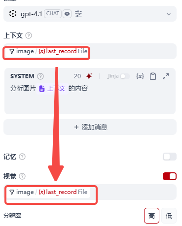- 打开视觉开关,如果上面视觉支持为不支持,这步视觉开关是被disable的,无法打开,这步的变量选择要和上下文中保存一致